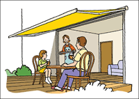 | リビングから庭へと通じる窓上にオーニングを取り付ければ、リビングと一体化した広々した屋外空間をつくれます。 |